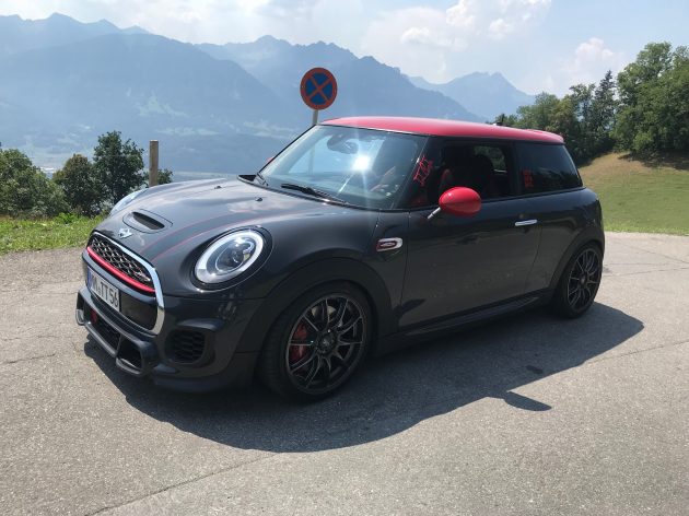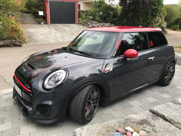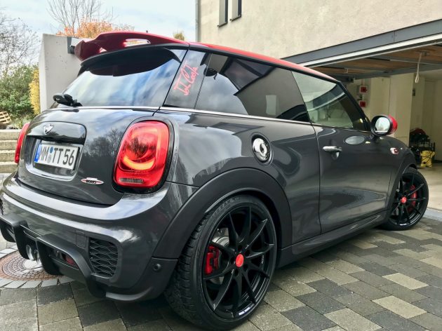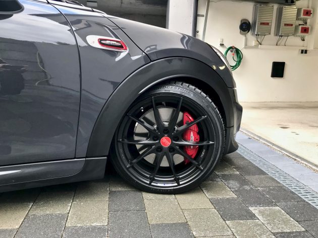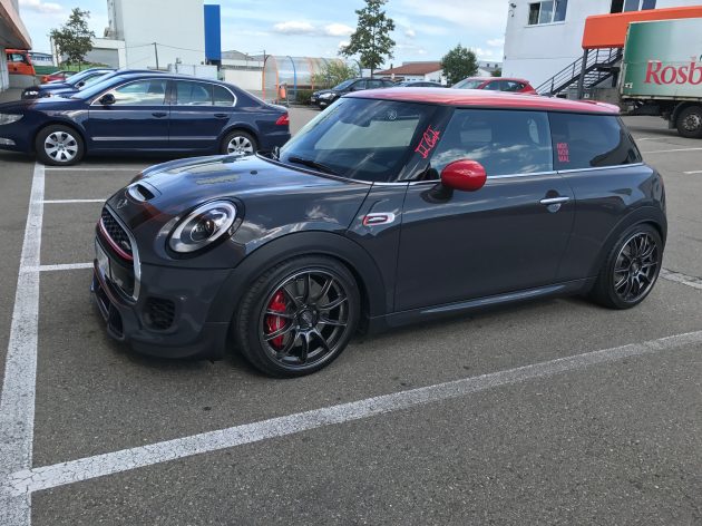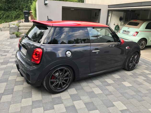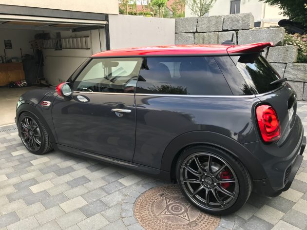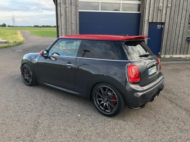 …Ms Thunderbird ist zu hause, mit KW SC Fahrwerk 325VA/330HA (optisch genau richtige Tiefe), Klappenauspuff JCW Pro (Hammerteil) und den OZ Hyper GT in 18 Zoll Star Graphite (sehr stimmig). Radläufe hinten mußten Innen mit dem Dremel bearbeitet werden um Schleifspuren zu vermeiden. Reifendruck kalt Hankooks V12 EVO2 VA 2,5bar / HA 2,3 bar.