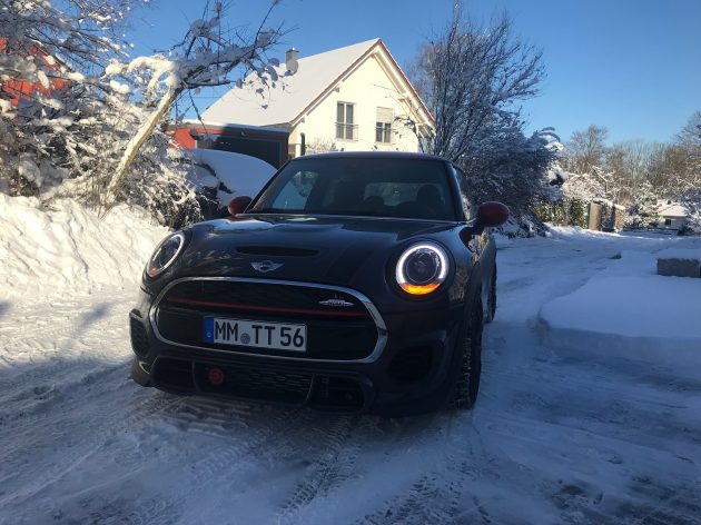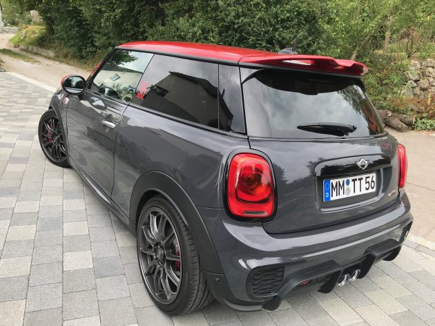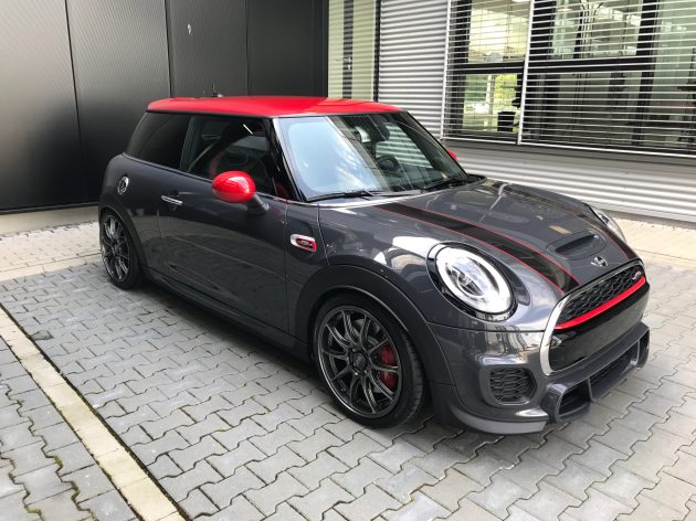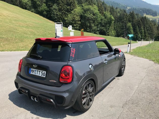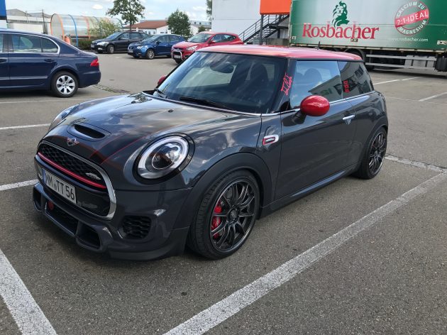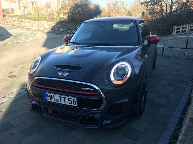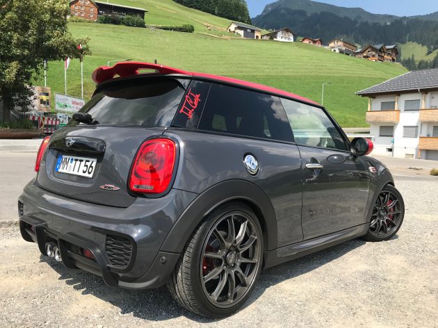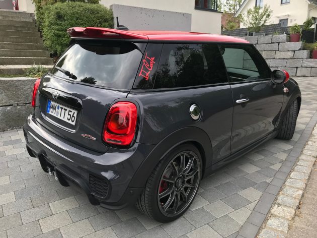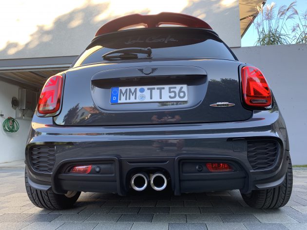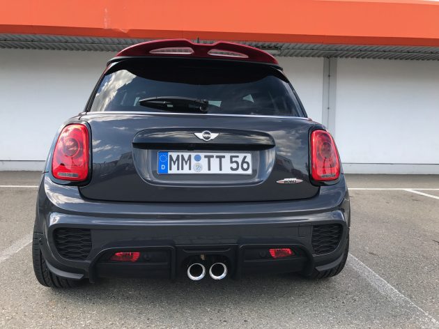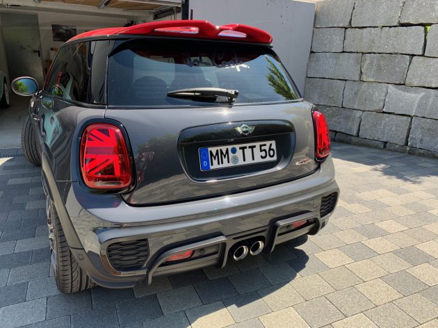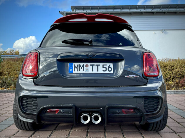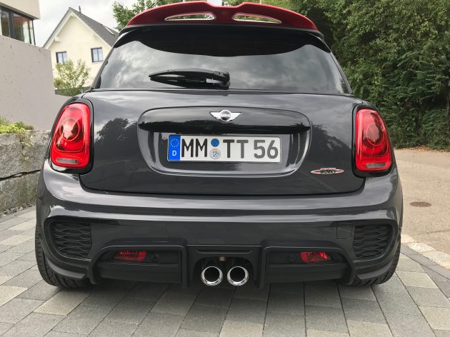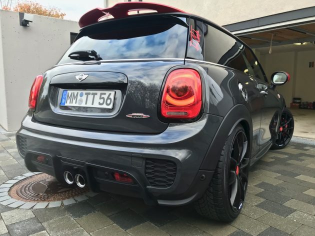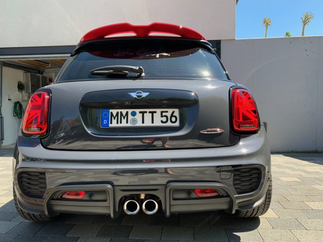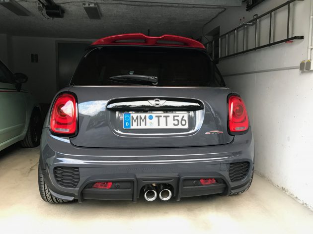 Auch einige Works Pro Teile werden den Renner verzieren: Diffusor vorne und hinten, Zierringe in schwarz vorne und hinten und last but not least noch der JCW Pro Klappenauspuff montiert.